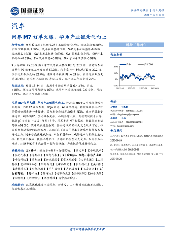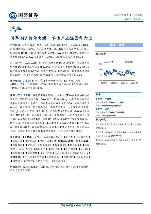 【国盛证券】【20231009】20231009-国盛证券-汽车行业周报:问界M7订单火爆,华为产业链景气向上-19页
