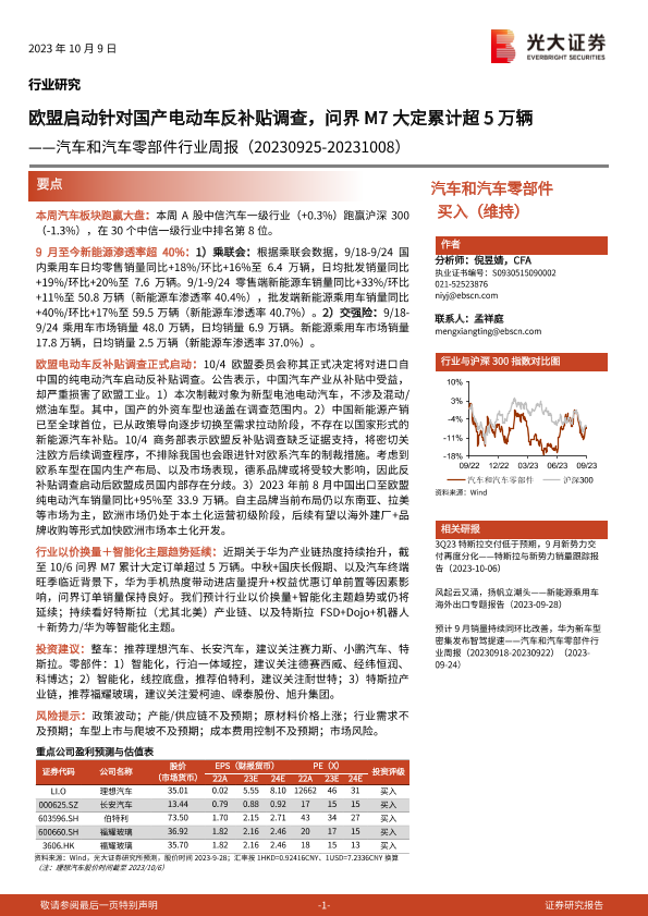 【光大证券】【20231009】汽车和汽车零部件行业周报:欧盟启动针对国产电动车反补贴调查,问界M7大定累计超5万辆-24页