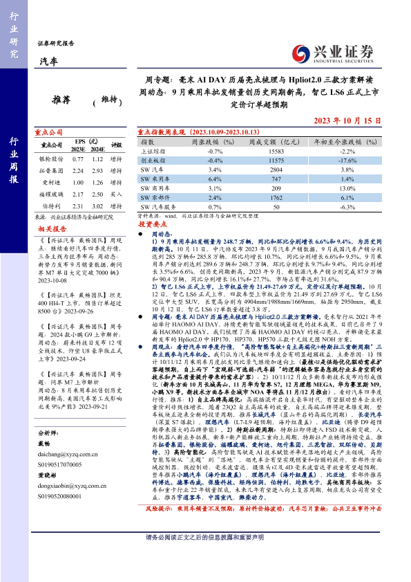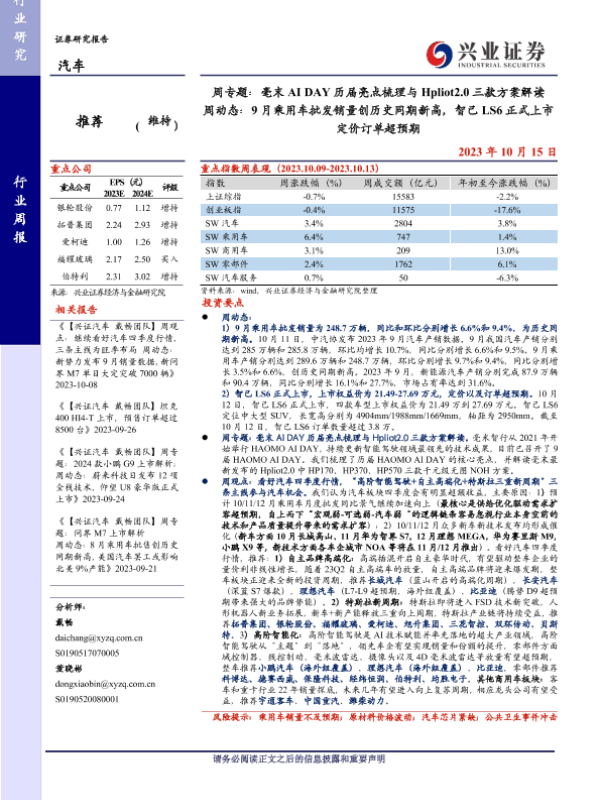 【兴业证券】【20231015】行业周报:周专题:毫末AIDAY历届亮点梳理与Hpliot2.0三款方案解读 周动态:9月乘用车批发销量创历史同期新高,智己LS6正式上市定价订单超预期-16页