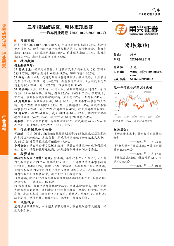 三季报 市场表现 投资建议 汽车行业 销量数据
