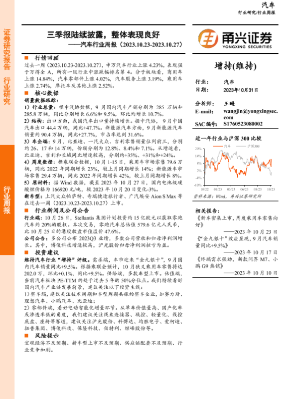 【甬兴证券】【20231031】20231031-甬兴证券-汽车行业周报:三季报陆续披露,整体表现良好-13页