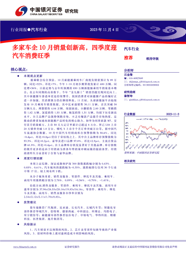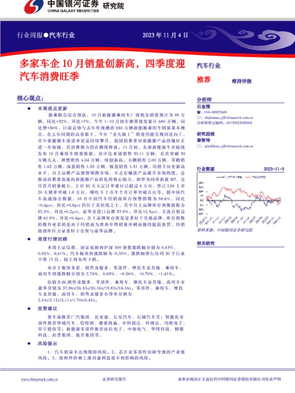 【银河证券】【20231104】汽车行业行业周报:多家车企10月销量创新高,四季度迎汽车消费旺季-13页