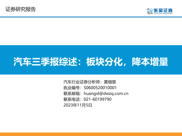 三季报 板块分化 汽车行业 证券分析 降本增效