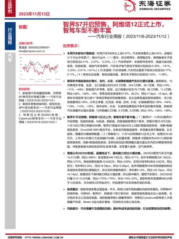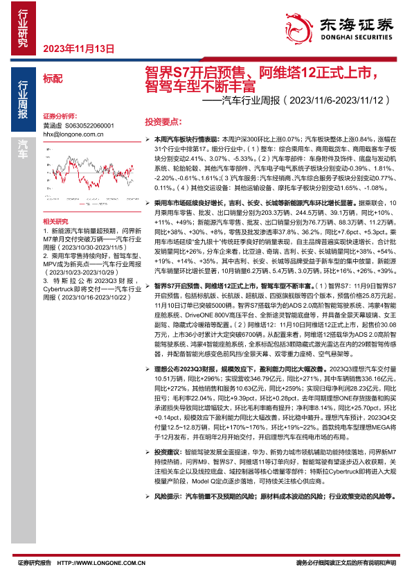 【东海证券】【20231113】智界S7开启预售、阿维塔12正式上市,智驾车型不断丰富-16页