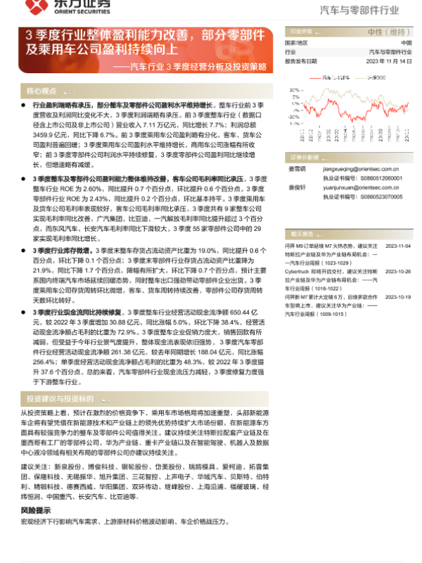 【东方证券】【20231114】20231114-东方证券-汽车行业3季度经营分析及投资策略:3季度行业整体盈利能力改善,部分零部件及乘用车公司盈利持续向上-23页