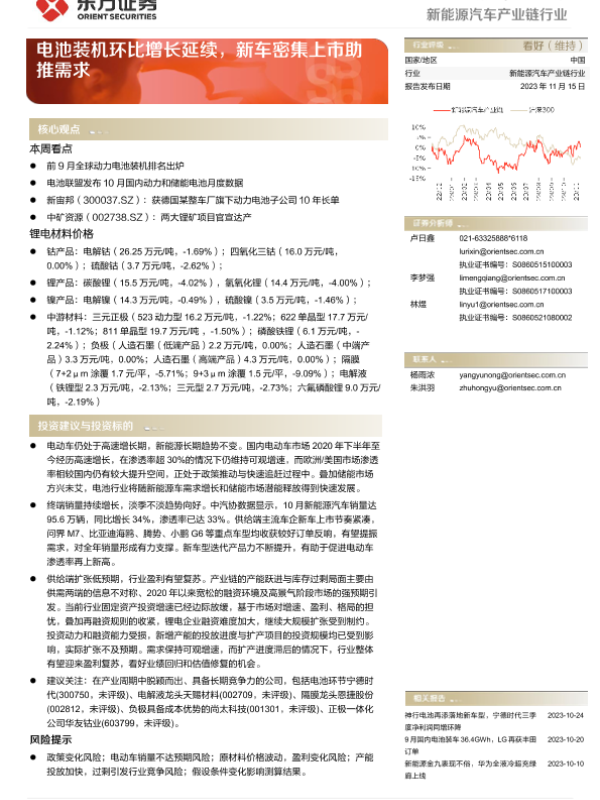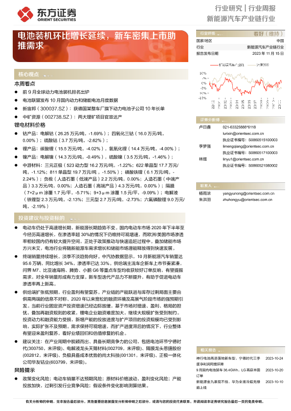 【东方证券】【20231115】20231115-东方证券-新能源汽车产业链行业周报:电池装机环比增长延续,新车密集上市助推需求-16页