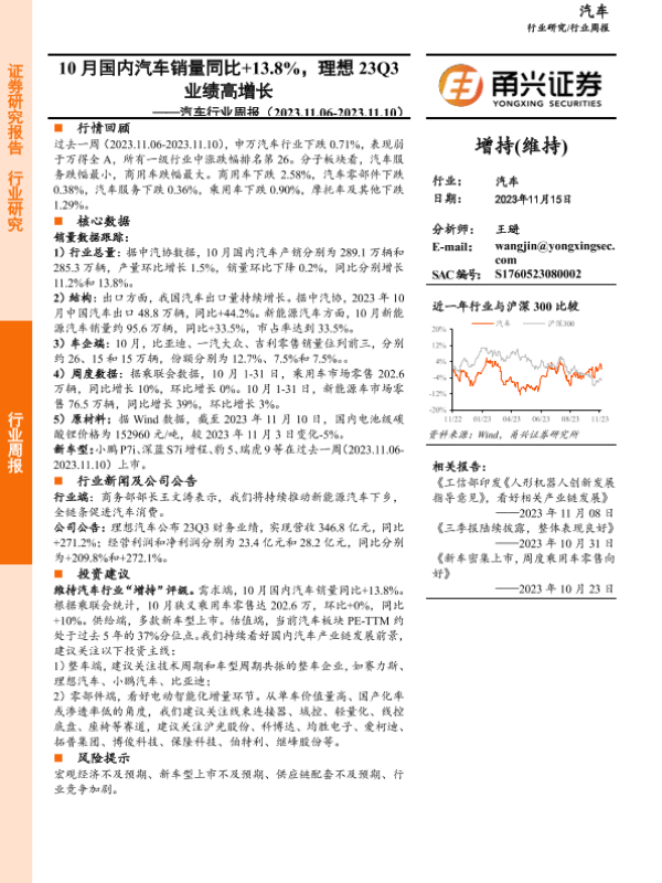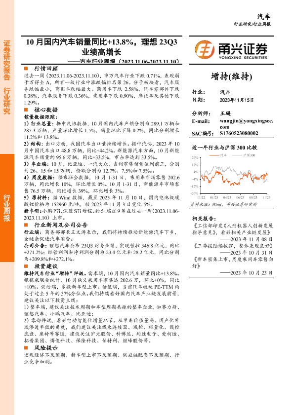 【甬兴证券】【20231115】20231115-甬兴证券-汽车行业周报:10月国内汽车销量同比+13.8%,理想23Q3业绩高增长-14页