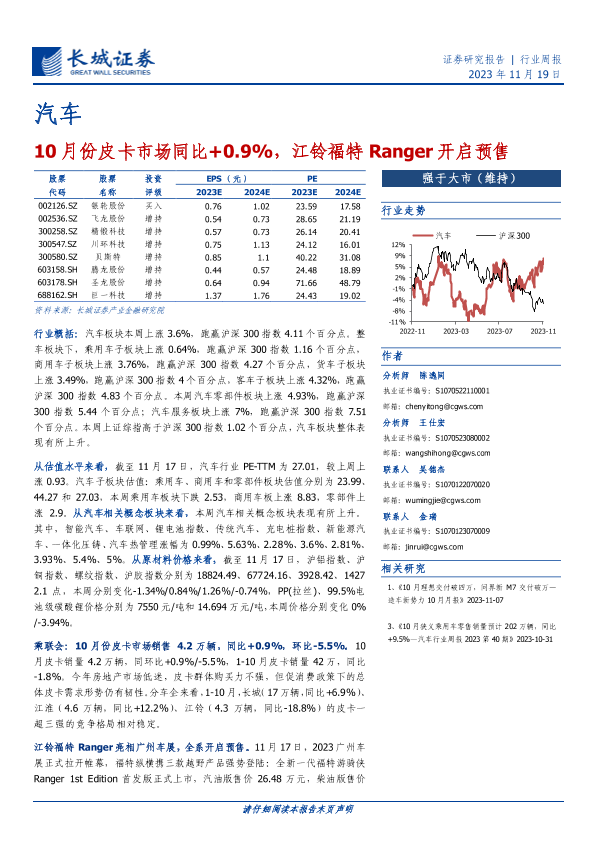 【长城证券】【20231119】20231119-长城证券-汽车行业周报:10月份皮卡市场同比+0.9%,江铃福特Ranger开启预售-12页