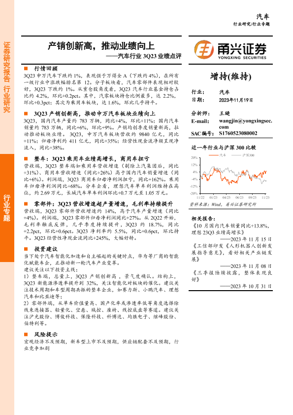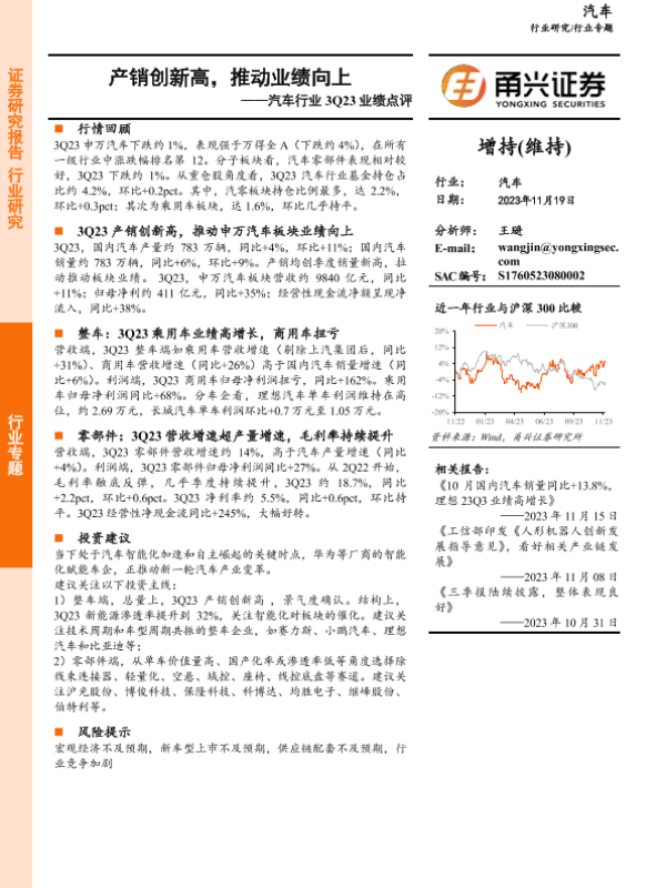 【甬兴证券】【20231119】汽车行业3Q23业绩点评:产销创新高,推动业绩向上-20页