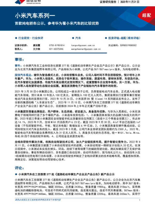 【国信证券】【20231121】小米汽车系列一:首款纯电轿车公示,参考华为看小米汽车的比较优势-14页