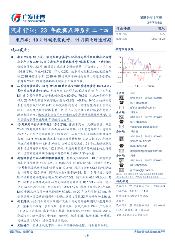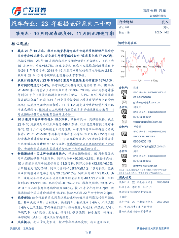 【广发证券】【20231122】汽车行业:23年数据点评系列二十四-乘用车:10月终端表现良好,11月同比增速可期-31页