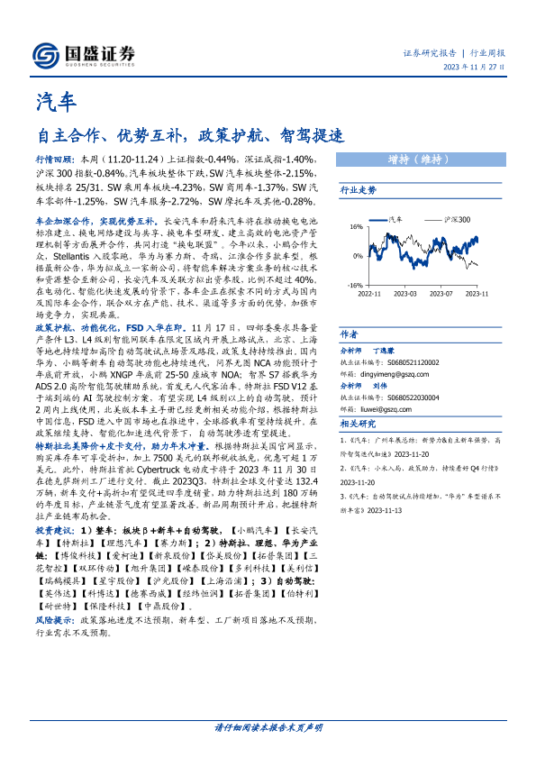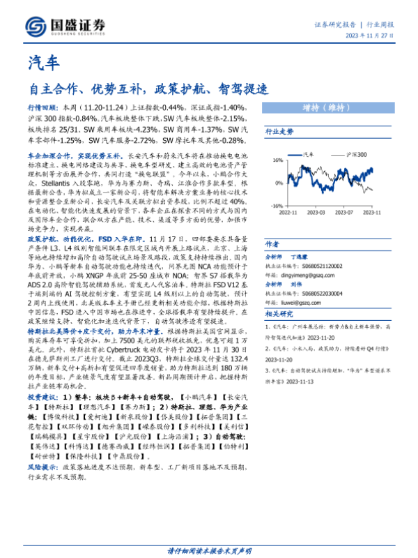 【国盛证券】【20231127】20231127-国盛证券-汽车行业周报:自主合作、优势互补,政策护航、智驾提速-19页