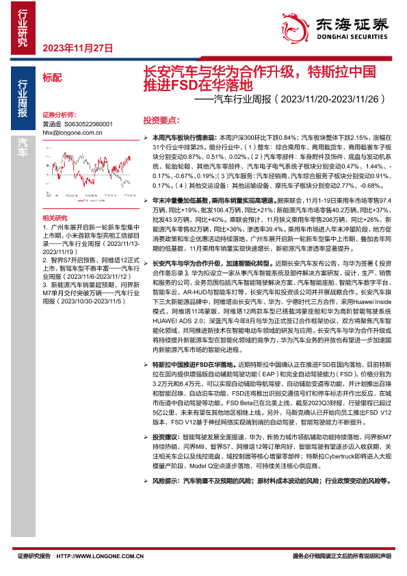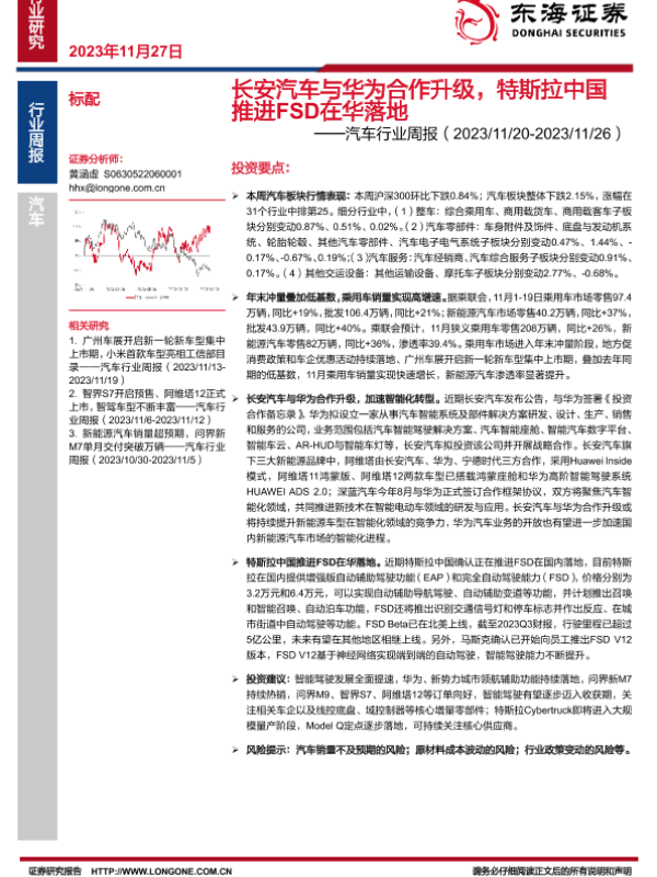 【东海证券】【20231127】长安汽车与华为合作升级,特斯拉中国推进FSD在华落地-11页