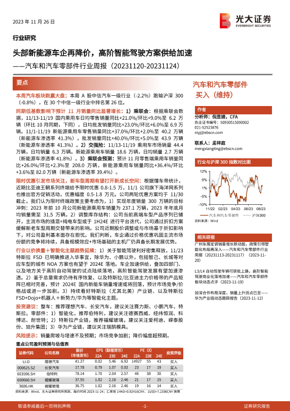【光大证券】【20231126】汽车和汽车零部件行业周报:头部新能源车企再降价,高阶智能驾驶方案供给加速-27页