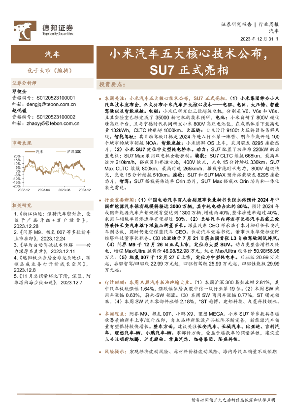 【德邦证券】【20231231】20231231-德邦证券-汽车行业周报:小米汽车五大核心技术公布,SU7正式亮相-13页