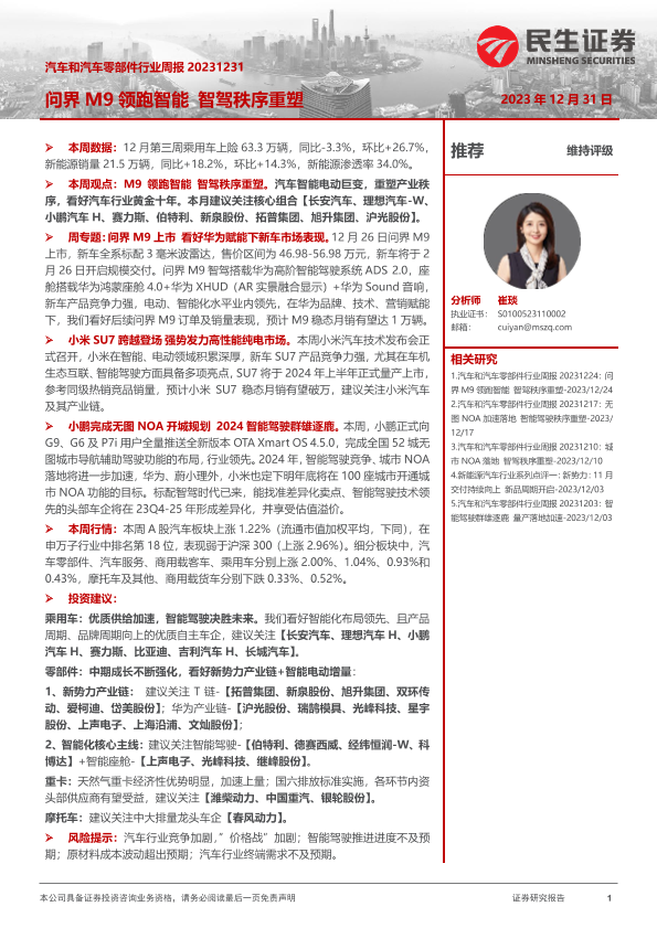 【民生证券】【20231231】汽车和汽车零部件行业周报:问界M9领跑智能 智驾秩序重塑-31页