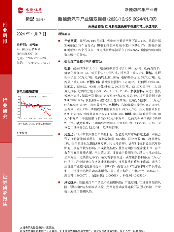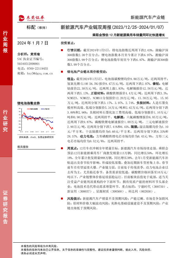 【东莞证券】【20240107】新能源汽车产业链双周报:乘联会预估12月新能源乘用车销量同环比快速增长-13页