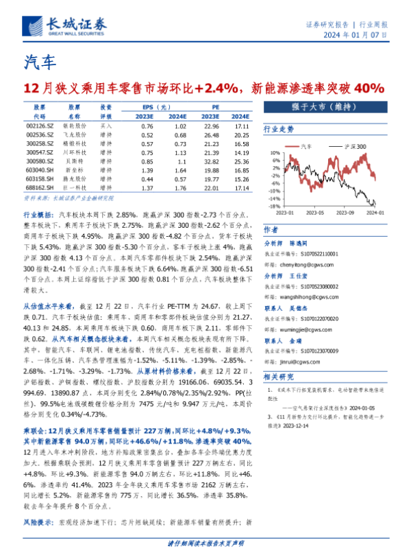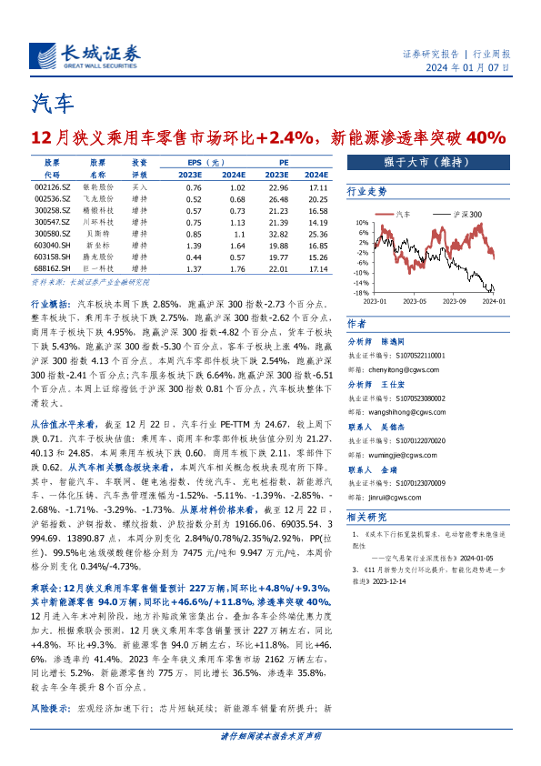 【长城证券】【20240107】20240107-长城证券-汽车行业周报:12月狭义乘用车零售市场环比+2.4%,新能源渗透率突破40%-12页