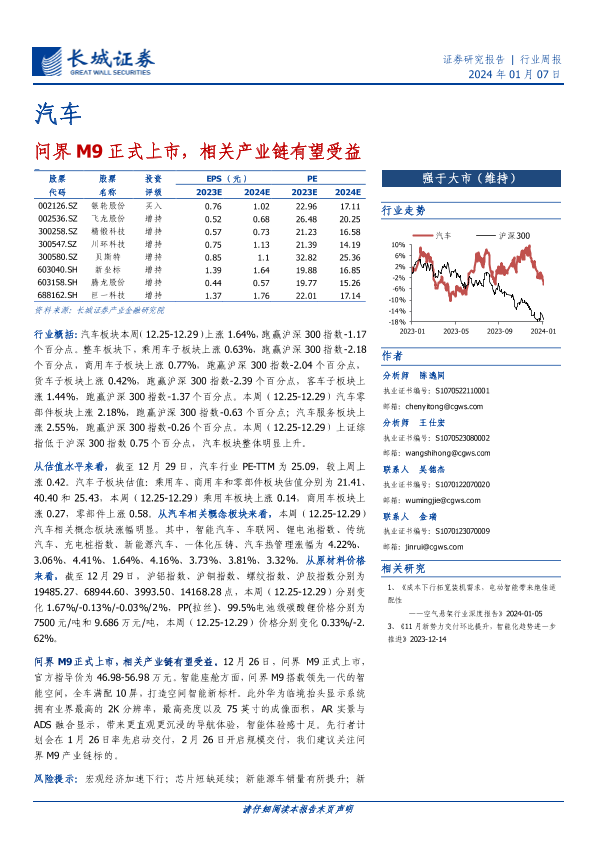 【长城证券】【20240107】20240107-长城证券-汽车行业周报:问界M9正式上市,相关产业链有望受益-12页