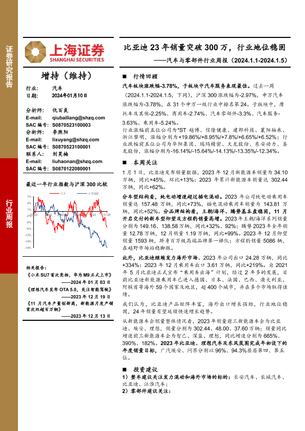 【上海证券】【20240110】汽车与零部件行业周报:比亚迪23年销量突破300万,行业地位稳固-12页