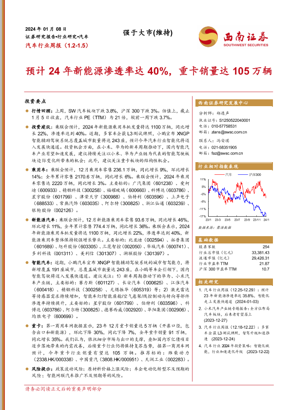 【西南证券】【20240108】汽车行业周报:预计24年新能源渗透率达40%,重卡销量达105万辆-18页
