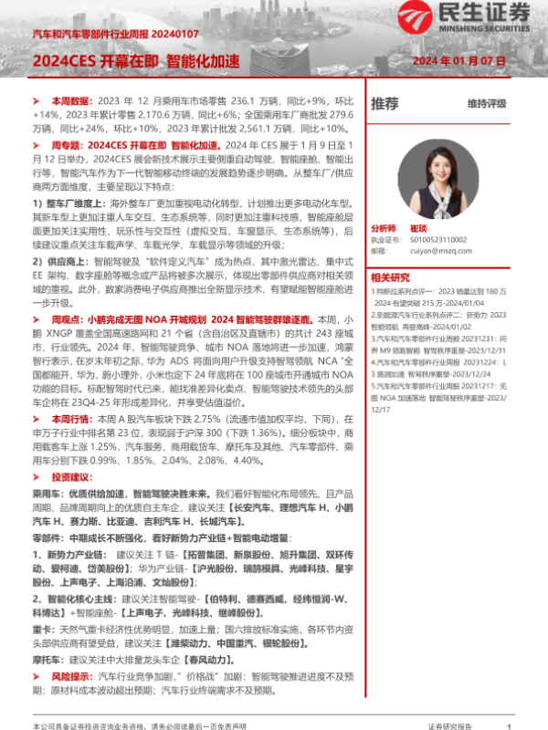 【民生证券】【20240107】汽车和汽车零部件行业周报:2024CES开幕在即智能化加速-33页