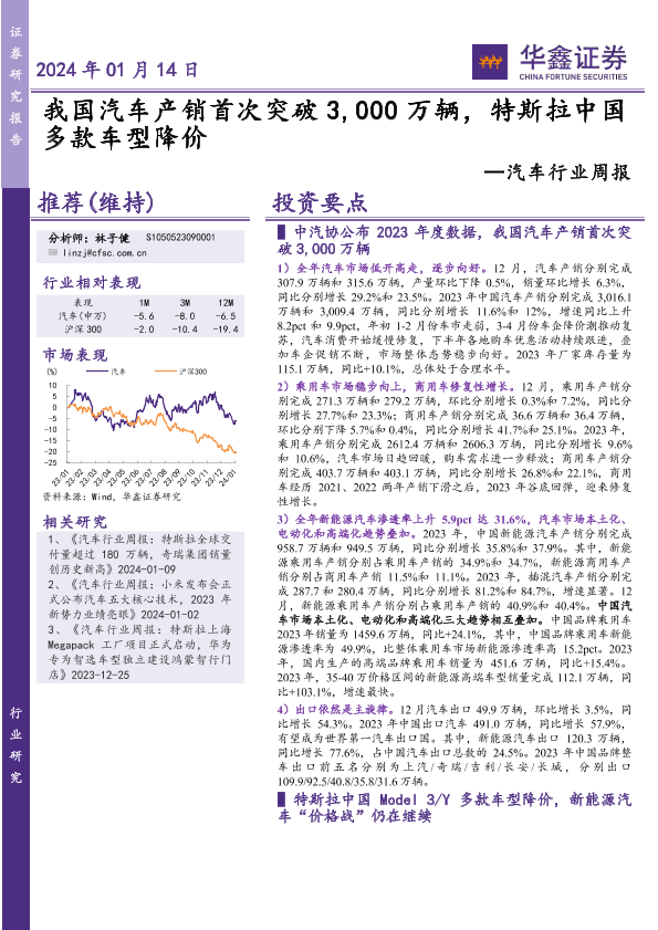 【华鑫证券】【20240114】20240114-华鑫证券-汽车行业周报:我国汽车产销首次突破3,000万辆,特斯拉中国多款车型降价-15页