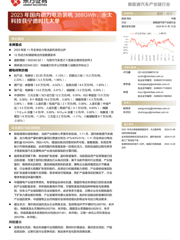 【东方证券】【20240115】20240115-东方证券-新能源汽车产业链行业周报:2023年国内动力电池装机388GWh,永太科技获宁德时代大单-15页
