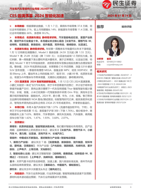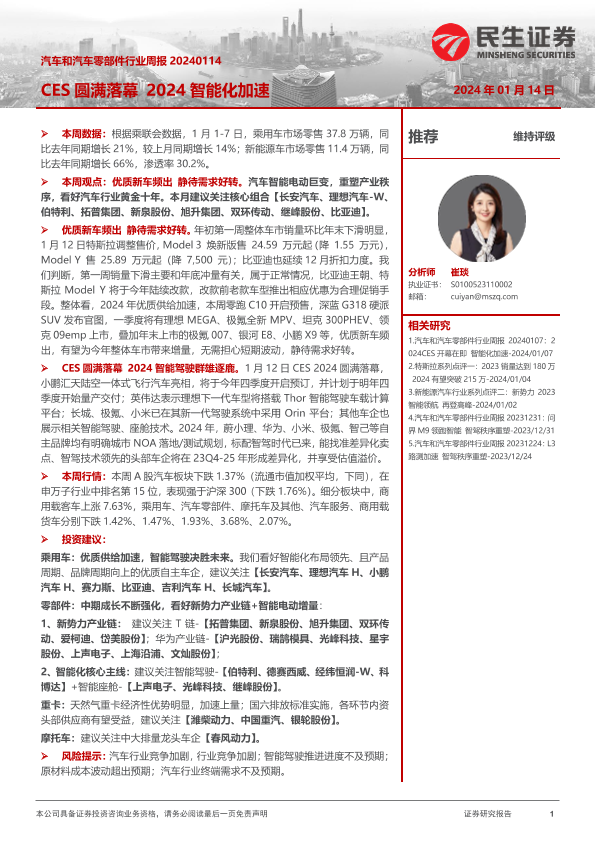 【民生证券】【20240114】汽车和汽车零部件行业周报:CES圆满落幕 2024智能化加速-22页