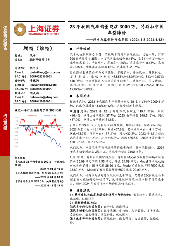 【上海证券】【20240117】23年我国汽车销量突破3000万,特斯拉中国车型降价-12页