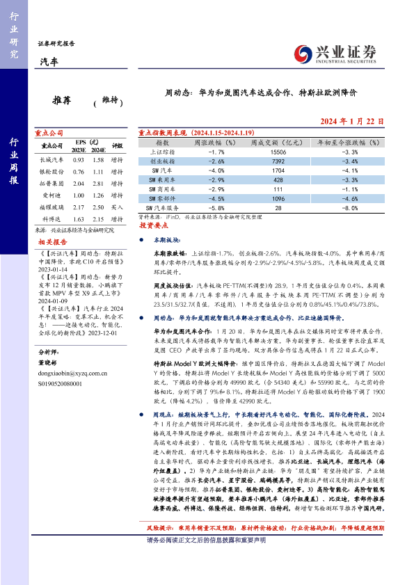 【兴业证券】【20240122】汽车周动态:华为和岚图汽车达成合作、特斯拉欧洲降价-13页