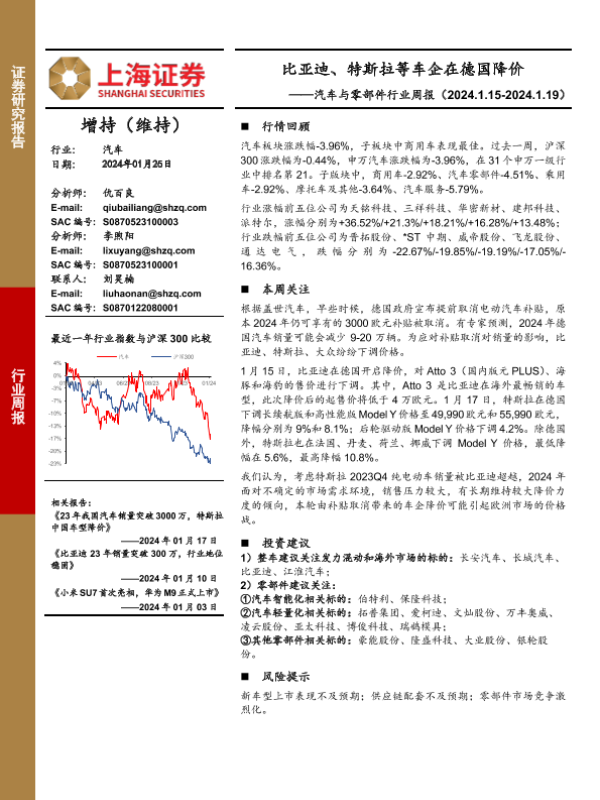 【上海证券】【20240125】20240125-上海证券-汽车与零部件行业周报:比亚迪、特斯拉等车企在德国降价-10页