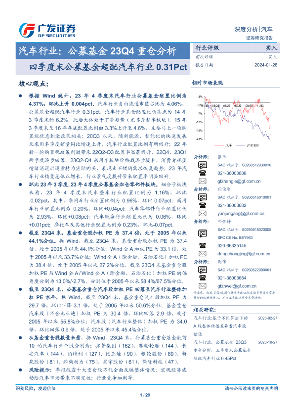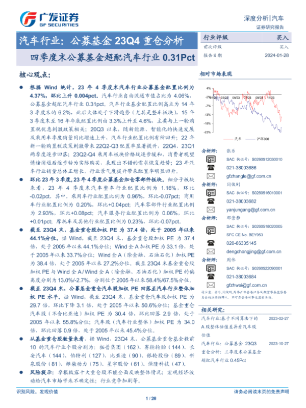 【广发证券】【20240128】汽车行业:公募基金23Q4重仓分析:四季度末公募基金超配汽车行业0.31Pct-26页