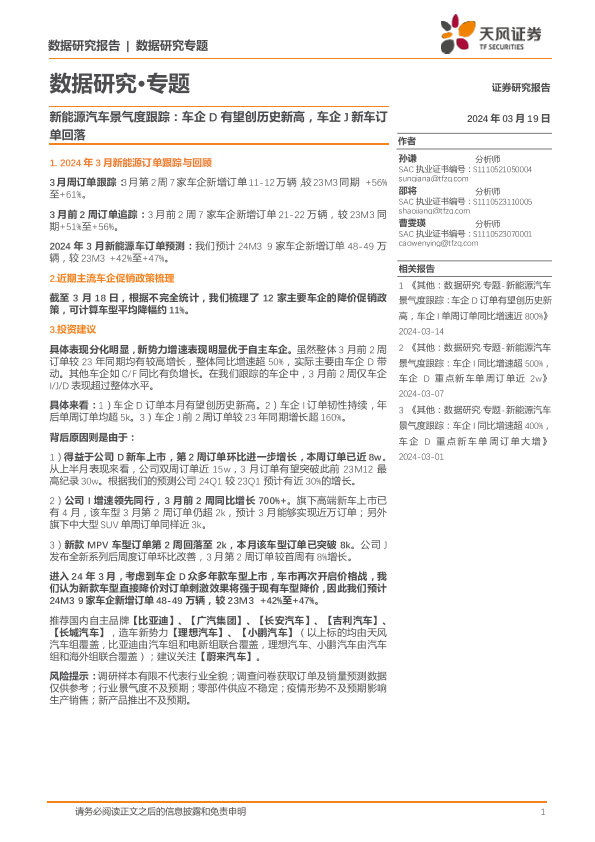 【天风证券】【20240319】20240319-天风证券-新能源汽车景气度跟踪:车企D有望创历史新高,车企J新车订单回落-10页