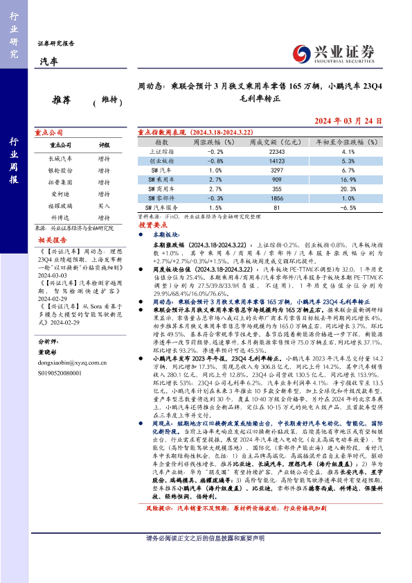 【兴业证券】【20240324】周动态:乘联会预计3月狭义乘用车零售165万辆,小鹏汽车23Q4毛利率转正-11页