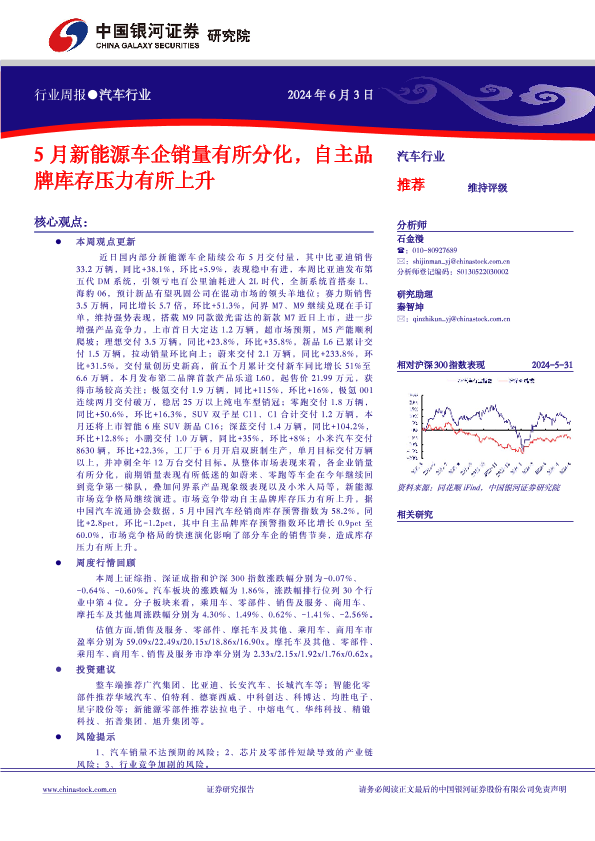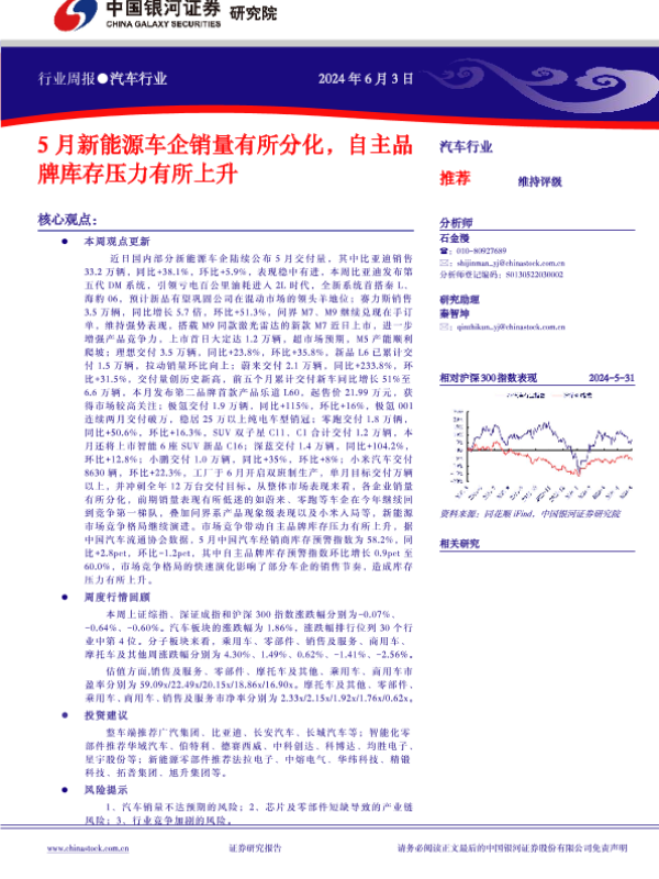 【银河证券】【20240603】20240603-中国银河-汽车行业行业周报:5月新能源车企销量有所分化,自主品牌库存压力有所上升-11页