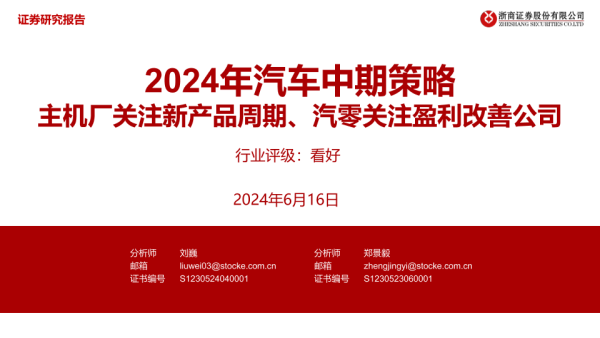 【浙商证券】【20240616】2024年汽车中期策略:主机厂关注新产品周期、汽零关注盈利改善公司-51页