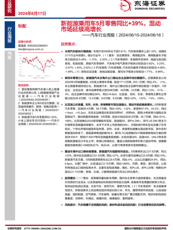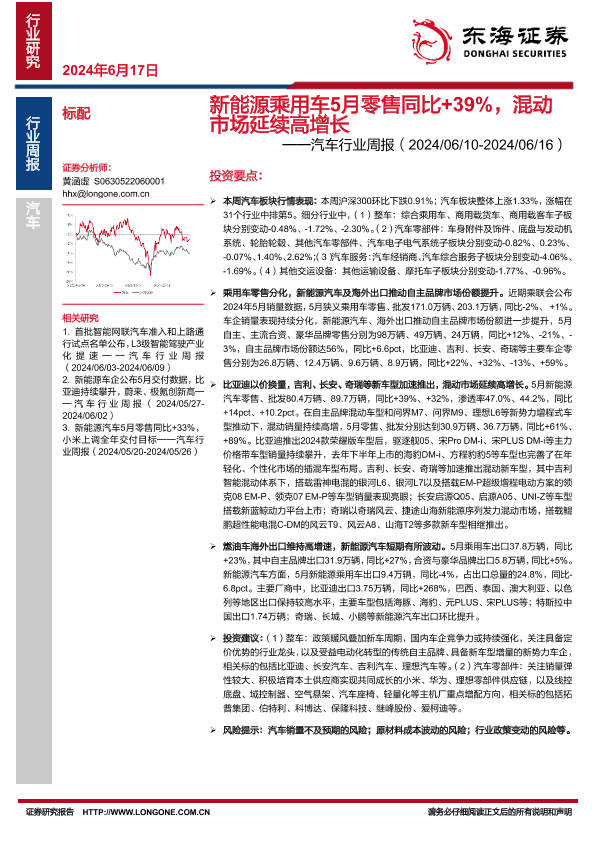 【东海证券】【20240617】新能源乘用车5月零售同比+39%,混动市场延续高增长-13页