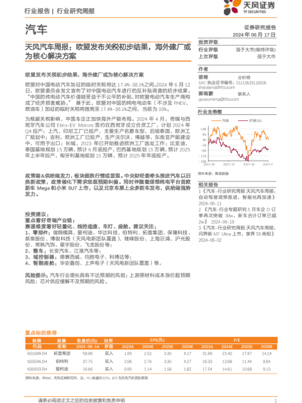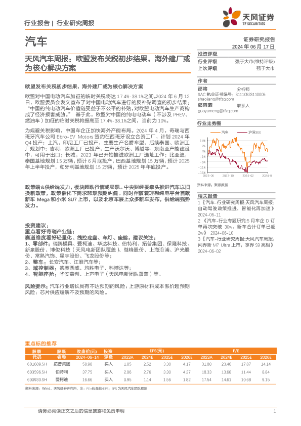 【天风证券】【20240617】天风汽车行业周报:欧盟发布关税初步结果,海外建厂或为核心解决方案-11页