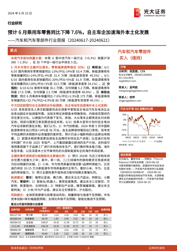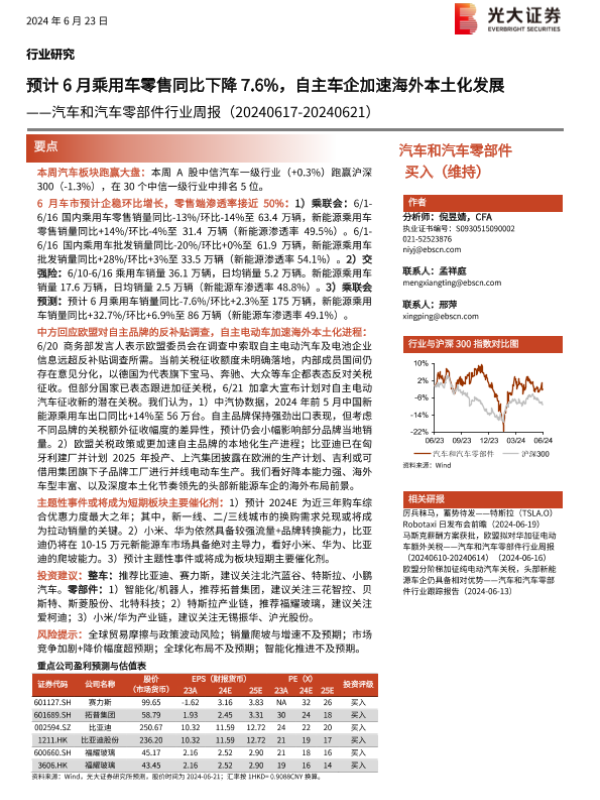 【光大证券】【20240623】汽车和汽车零部件行业周报:预计6月乘用车零售同比下降7.6%,自主车企加速海外本土化发展-35页