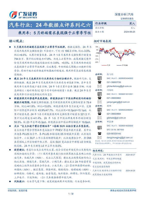 【广发证券】【20240625】汽车行业:24年数据点评系列之六:乘用车:5月终端需求表现强于正常季节性-32页