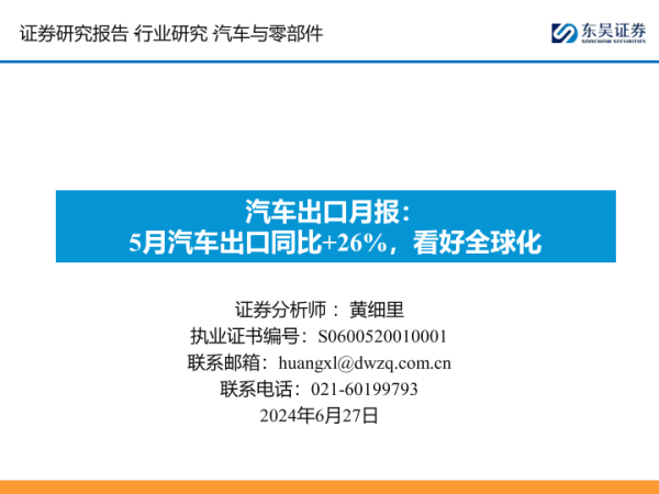 【东吴证券】【20240627】汽车出口月报:5月汽车出口同比+26%,看好全球化-28页
