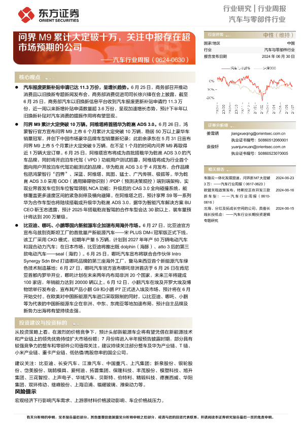 【东方证券】【20240630】20240630-东方证券-汽车行业周报:问界M9累计大定破十万,关注中报存在超市场预期的公司-18页