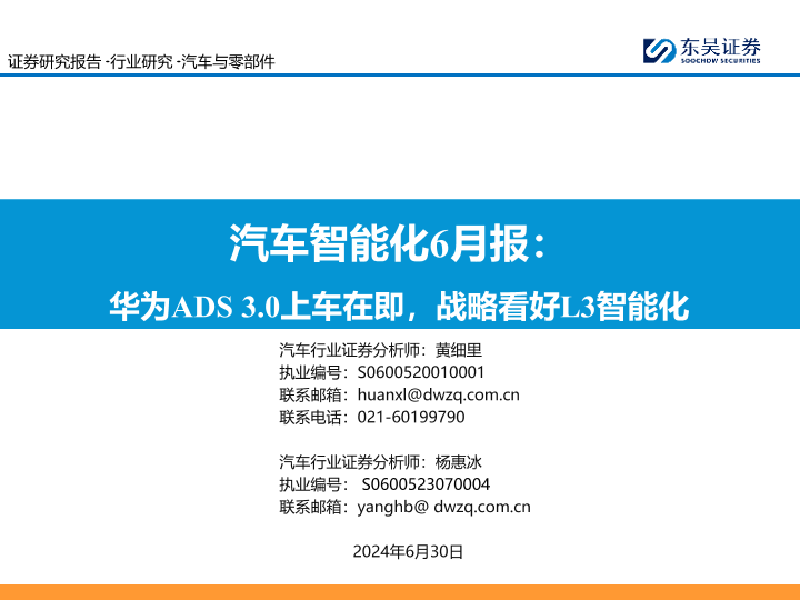 【东吴证券】【20240630】汽车智能化6月报:华为ADS 3.0上车在即,战略看好L3智能化-39页
