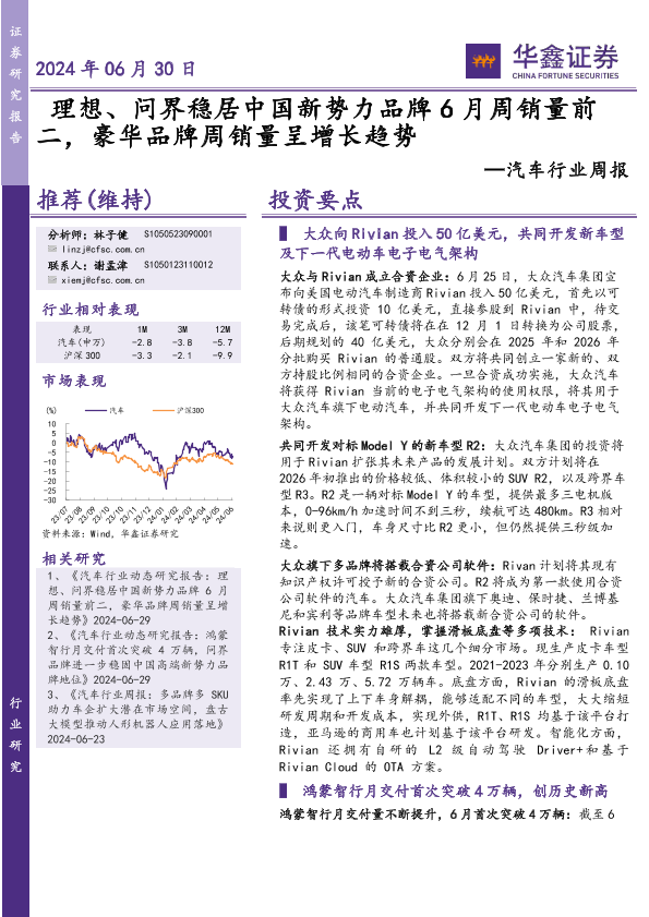 【华鑫证券】【20240630】20240630-华鑫证券-汽车行业周报:理想、问界稳居中国新势力品牌6月周销量前二,豪华品牌周销量呈增长趋势-16页