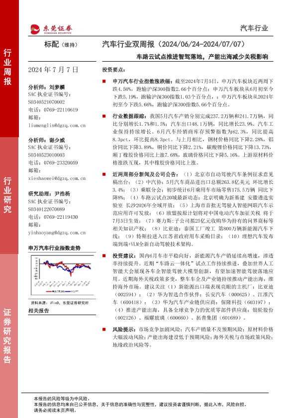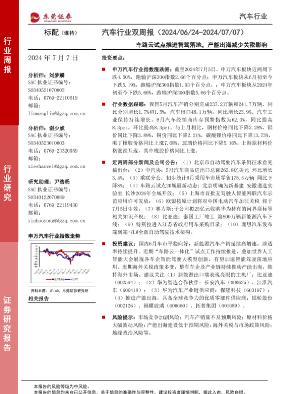 【东莞证券】【20240707】汽车行业双周报:车路云试点推进智驾落地,产能出海减少关税影响-12页