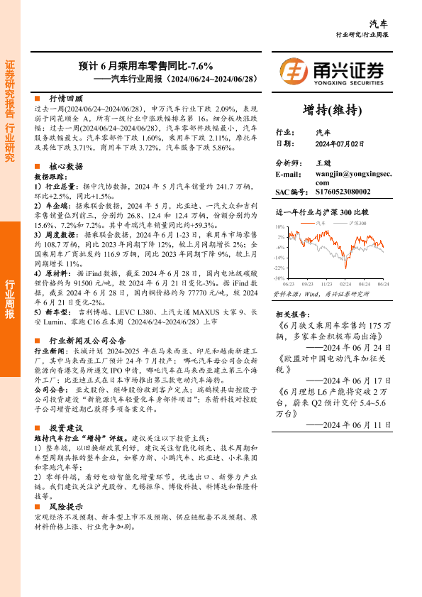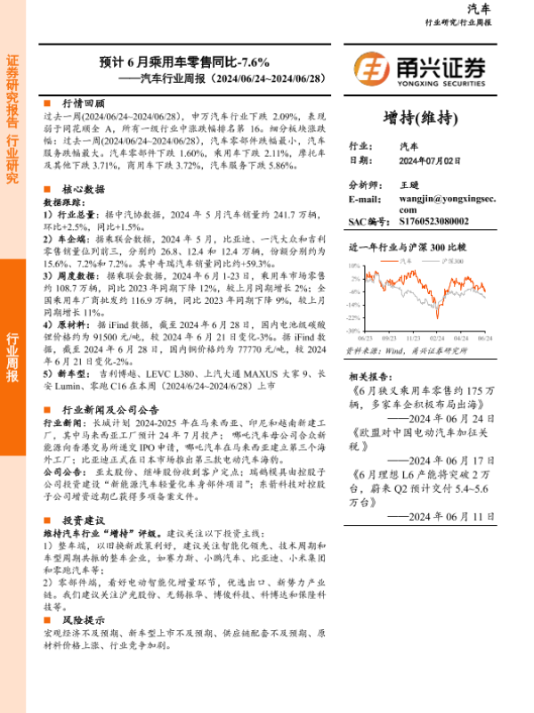 【甬兴证券】【20240702】20240702-甬兴证券-汽车行业周报:预计6月乘用车零售同比-7.6%-13页