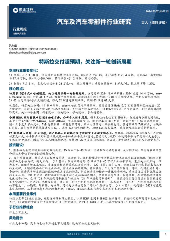 【国金证券】【20240707】汽车及汽车零部件行业研究:特斯拉交付超预期,关注新一轮创新周期-13页