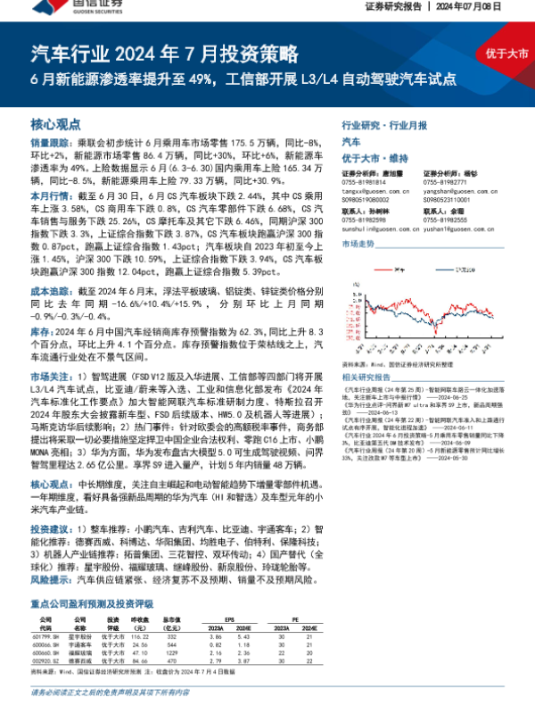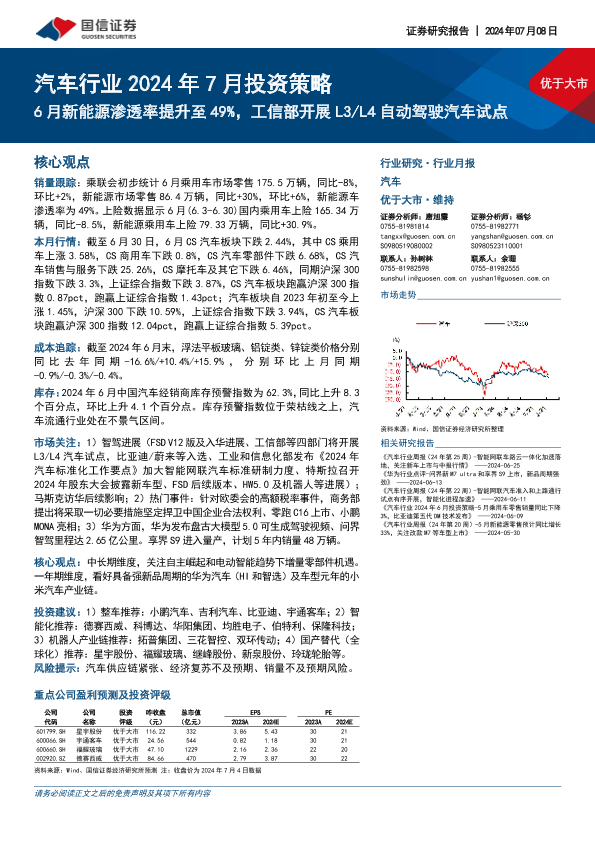 【国信证券】【20240708】汽车行业2024年7月投资策略:6月新能源渗透率提升至49%,工信部开展L3 L4自动驾驶汽车试点-31页