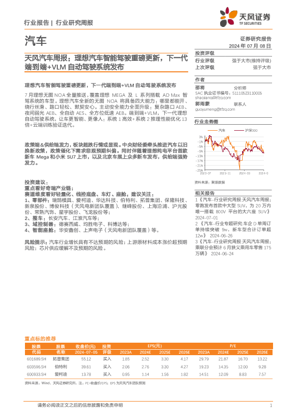 【天风证券】【20240708】天风汽车周报:理想汽车智能驾驶重磅更新,下一代端到端+VLM自动驾驶系统发布-14页